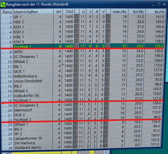 Auch Fischbek 3 hatte einen holprigen Start, doch kletterte im Laufe des Turniers Platz um Platz nach oben. Die Jugend hat eben noch Power, um 11 Runden ohne Konzentrationsverlust zu spielen.
