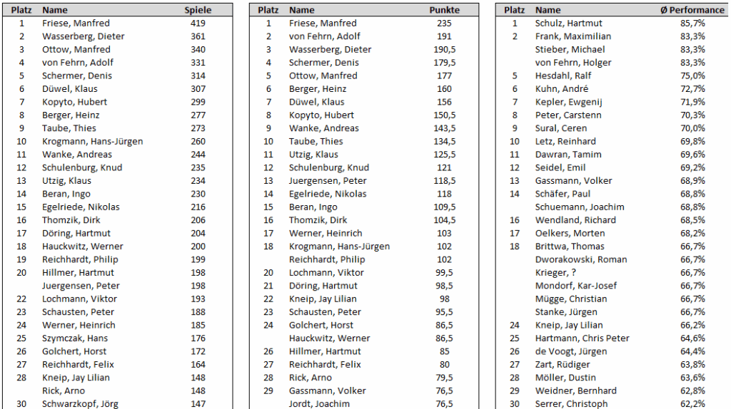 Spieleinsätze | erzielte Punke | Performance (ab 3 Einsätzen)